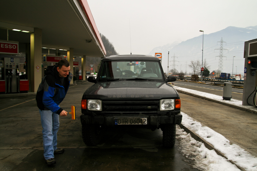 Na jednej ze stacji czyścimy światła, które bardzo szybko na autostradzie oblepiają się błotem pośniegowym