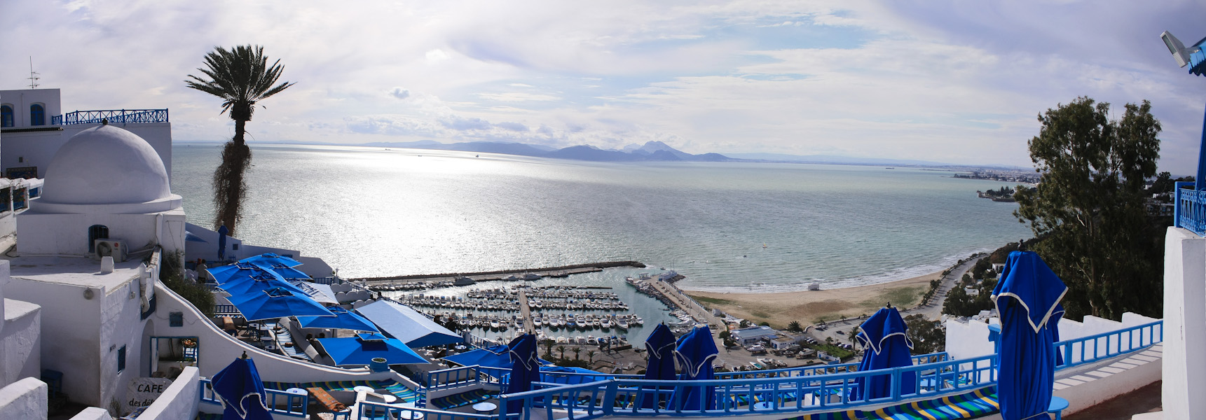 Szeroka panorama z portem Sidi Bou Said u podnóża klifu