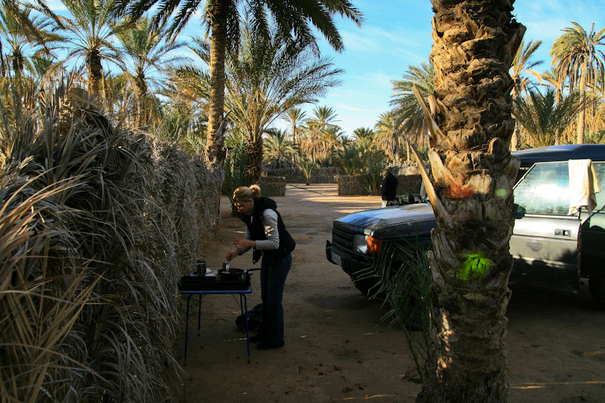 znowu na kempingu w Douz, a po śniadaniu postanawiamy pokręcić się po okolicy i poszukać wydm.